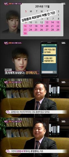 日前,SBS电视台节目《深夜TV演艺》,金贤重的前女友崔某的律师正式公开了崔某的怀孕证明和金贤重的短信。