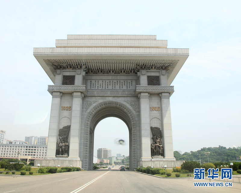 朝鲜凯旋门位于首都平壤牡丹峰山脚下的凯旋广场,是一座纪念碑式的建筑,于1982年建成。凯旋门高60米,宽52.5米,整座建筑用一万零五百多块精雕细琢的高级花岗石砌成,规模宏大。有3层歇山式的屋顶,柱檩之间配有各式装饰,体现了朝鲜传统建筑特点。拱门是朝鲜传统的城门形式,高27米,宽18米,可同时开行几辆汽车。门柱正面镌刻着白头山、金日成将军之歌和金日成投身革命到凯旋回国的年代1925、1945金色字样。 门柱边缘有70块金达莱花纹浮雕石板,标志着金日成同志的70寿辰。南北两侧壁面上还有朝鲜人民遵循金日成教诲为祖国建设积极奋斗的浮雕群像。新华网记者曾涛 摄