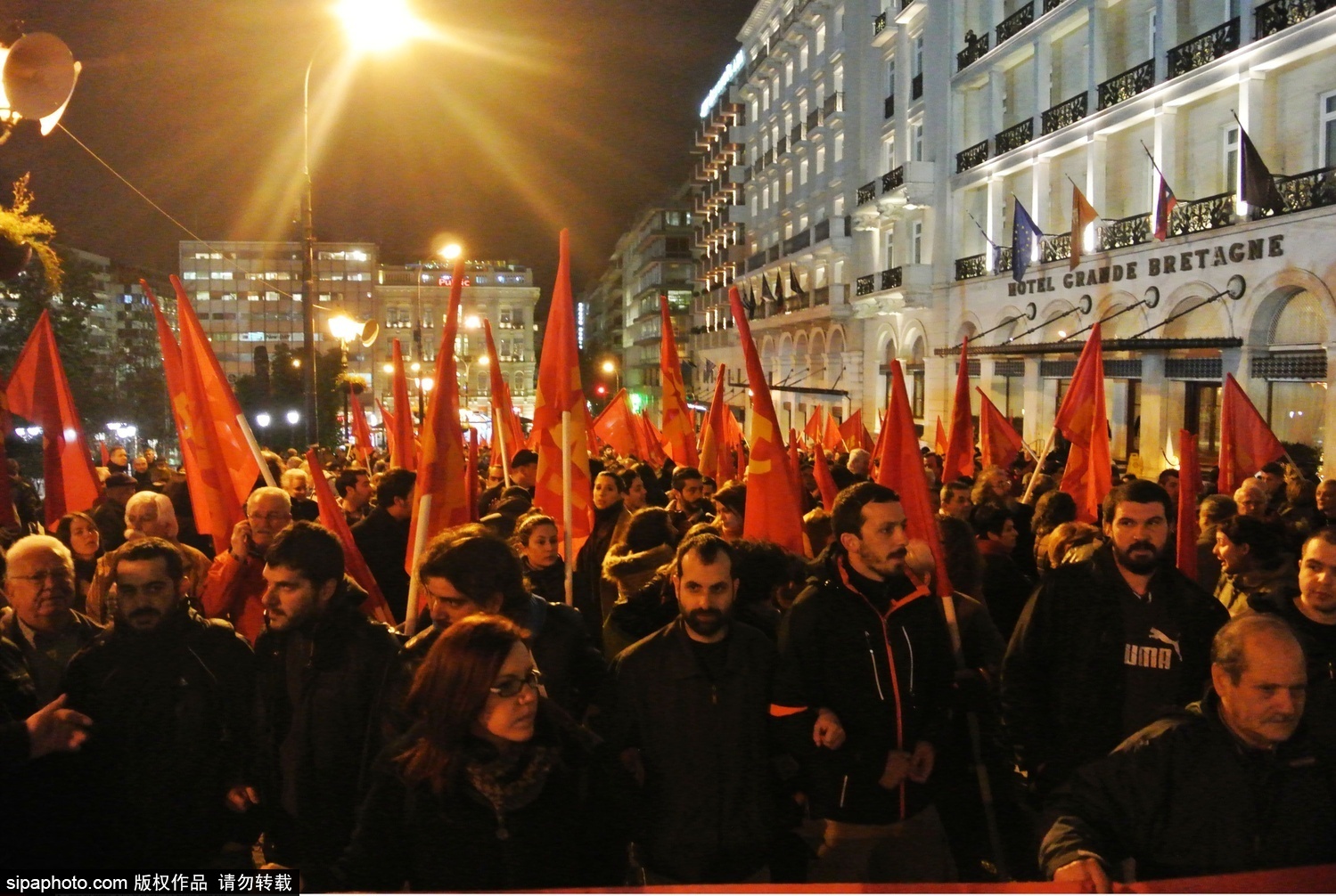 当地时间2015年2月27日,希腊雅典,希腊共产党支持者高举红旗在希腊议会前举行反政府游行,反对希腊政府跟IMF和欧行签署关于希腊的国际外债协议。(图片来源:SIPA)