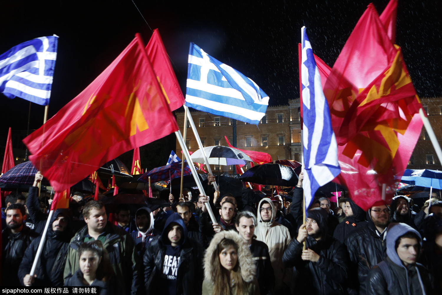当地时间2015年2月27日,希腊雅典,希腊共产党支持者高举红旗在希腊议会前举行反政府游行,反对希腊政府跟IMF和欧行签署关于希腊的国际外债协议。(图片来源:SIPA)