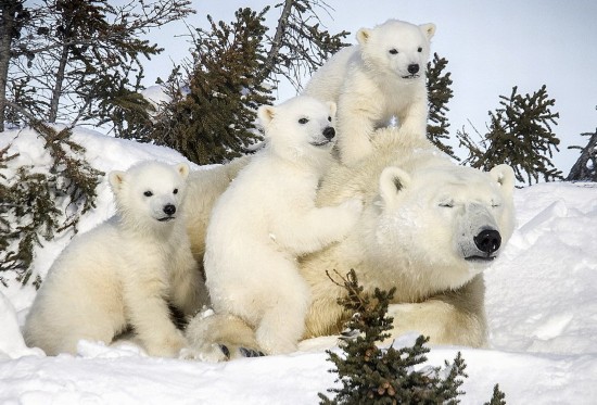 加拿大瓦普斯克国家公园(Wapusk National Park)中,3头北极熊幼崽围绕在母亲身边。(网页截图)