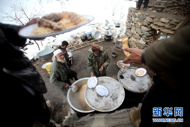 受灾村民用政府援助的米、油、肉等物资做饭。Ahmad Massoud 摄