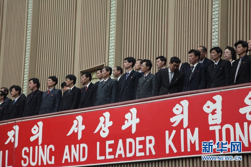 主体思想大会上的标语和参加者。新华社记者曾涛摄