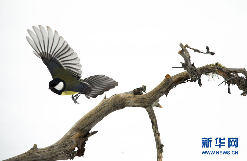 3月1日,(芬兰)乌塔耶尔维,一只大山雀在雪地觅食。新华社记者张璇 摄