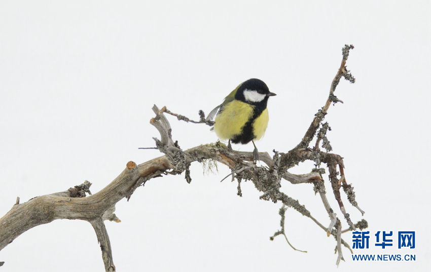 3月1日,(芬兰)乌塔耶尔维,一只大山雀在雪地觅食。新华社记者张璇 摄