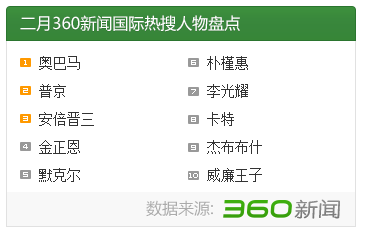 新华网北京3月4日电 据360新闻搜索数据,2015年2月最受关注的十大国际新闻人物排行榜最新出炉,奥巴马、普京、安倍晋三分别位列榜单前三位。