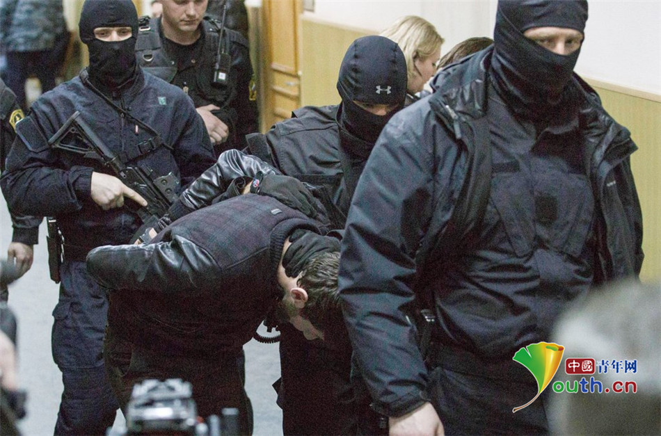 当地时间2015年3月8日,俄罗斯莫斯科,涉嫌杀害反对派政治家鲍里斯·涅姆佐夫(Boris Nemtsov)的嫌疑人出席庭审。涅姆佐夫2月27日在克里姆林宫附近的一座桥上被枪杀。