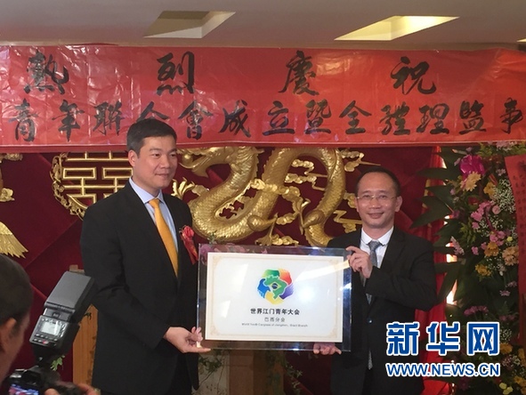 专程前来参加庆典仪式的江门市外事侨务局局长梁富鸣向陈文添转交了世界江门青年大会巴西分会会牌和聘书。他表示,作为世界江门青年大会的海外联络分部,巴西江门五邑青年联合会肩负着团结当地各界青年精英,凝聚华侨力量,推动当地与江门合作交流的重任,希望能够当好中国与巴西友好交往的使者,为两国人民不断加深了解继续做出努力。