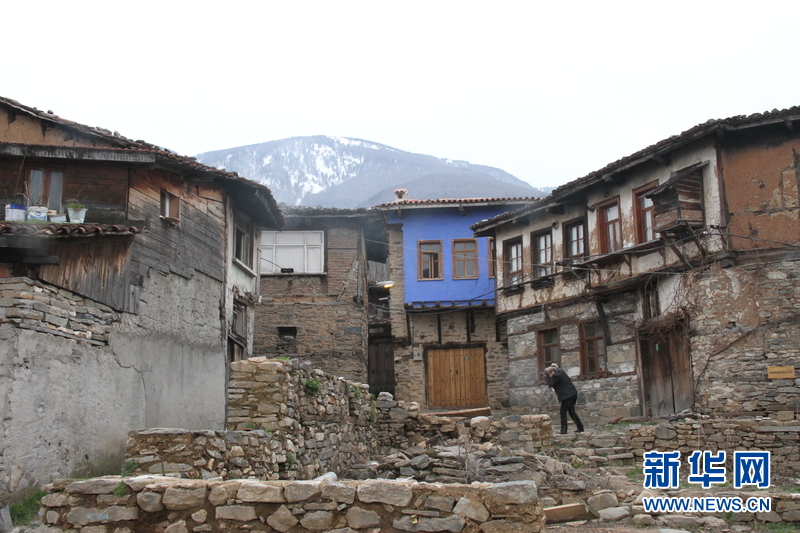 土耳其布尔萨省的朱玛勒克泽克村修复后的蓝色房子和未修复的老房子。(记者 郑金发 摄)