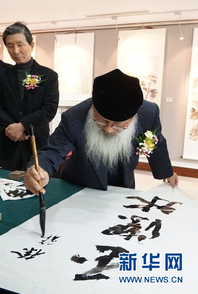 3月11日,国际书法艺术联合会韩国本部理事长权昌伦现场交流创作“玉洁冰心”书法作品。新华网记者 彭茜 摄