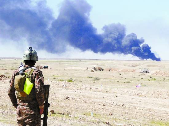 3月11日,在伊拉克提克里特,伊拉克安全部队人员远眺遭极端组织“伊斯兰国”破坏的阿吉勒油田冒出的滚滚黑烟。“伊斯兰国”武装分子点燃阿吉勒油田的油井制造烟雾,试图干扰对其实施的空袭。伊军队12日继续在北部萨拉赫丁省首府提克里特展开军事行动,力争从“伊斯兰国”武装手中解放提克里特。 新华社/法新