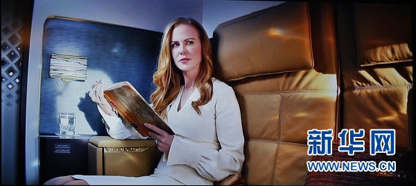 在阿布扎比举行的阿提哈德航空全新电视广告片“重塑飞行新形象”全球首映式上,放映的由好莱坞女星妮可·基德曼出演的电视广告片。 新华社记者安江 摄