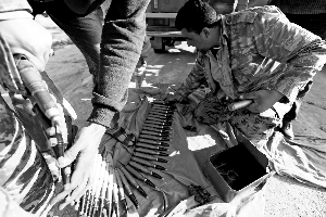 3月15日,在利比亚北部城市苏尔特,利比亚宗教民兵武装“利比亚黎明”成员准备弹药。利比亚宗教民兵武装“利比亚黎明”在北部城市苏尔特与极端组织“伊斯兰国”的冲突15日持续,目前已造成至少20人死亡。