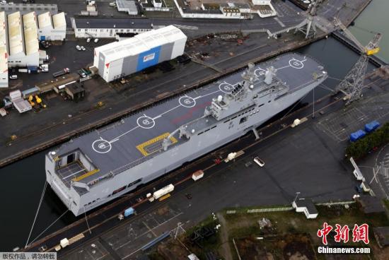 资料图:当地时间2014年12月7日,法国圣纳泽尔,法国为俄罗斯建造的“西北风级”两栖攻击舰“符拉迪沃斯托克”号停泊在当地港口。