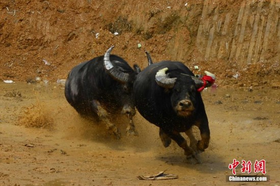 3月17日消息,斗牛是苗族侗族地区群众十分喜爱的有着悠久历史的民间娱乐活动,每逢节日喜庆,必以斗牛取乐助兴。贵州省从江境内苗族侗族的斗牛风俗,已经成为这一区域的文化现象。斗牛比赛十分激烈、异常精彩,六对“公牛”(指集体饲养的)一对“私牛”(指个人饲养的)逐一捉对“厮杀”。每头斗牛都体壮臀圆,非常好斗,“牛气”十足,令现场观众大饱眼福。中新社发 谌鸿溪 摄 图片来源:CNSPHOTO