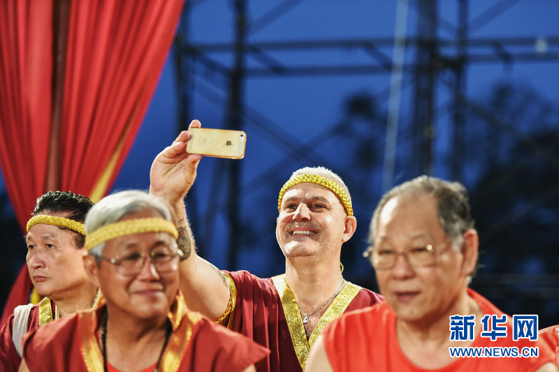 3月17日晚,在泰国大城府,一位泰拳导师在第十一届世界泰拳拜师大会上用手机自拍。新华网记者 李芒茫 摄