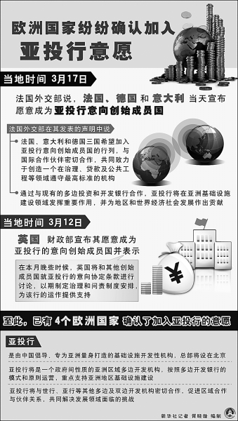 按照国际惯例,创始成员国往往享有参与规则制定的权力,非创始国则不享有,也不能担任高层。3月12日,英国向中国提交了作为意向创始成员国加入亚投行的确认函,正式申请加入亚投行,成为首个申请加入亚投行的主要西方国家。3月17日,法国、意大利和德国宣布将申请作为意向创始成员国加入亚投行,并将尽快向中方提交书面确认函。