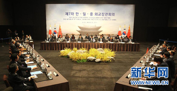 新华网首尔3月21日电 中国外交部长王毅21日在首尔同韩国外长尹炳世、日本外相岸田文雄共同出席第七次中日韩外长会。
