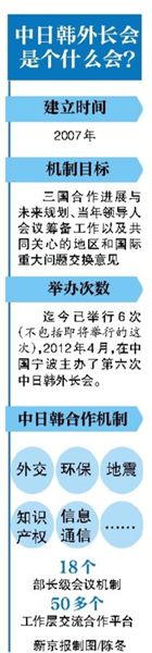 中日韩外长会议机制于2007年建立,2012年4月,中国在宁波主办了第六次中日韩外长会。