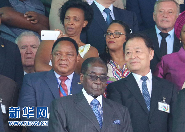 3月21日,在纳米比亚首都温得和克独立体育场,中国国家主席习近平特使、交通运输部部长杨传堂(右)出席就职典礼。当日,纳米比亚新总统哈格·根哥布在首都温得和克宣誓就职。 新华社记者吴长伟摄