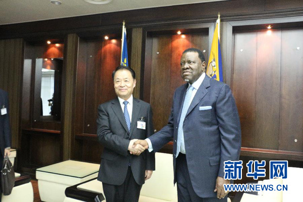 3月21日,在纳米比亚首都温得和克,纳新任总统根哥布(右)会见习近平主席特使、交通运输部部长杨传堂。习近平主席特使、交通运输部部长杨传堂21日应邀出席在纳米比亚首都温得和克举行的纳新任总统根哥布就职仪式及纳独立25周年庆典,并会见了根哥布总统。新华社记者吴长伟摄