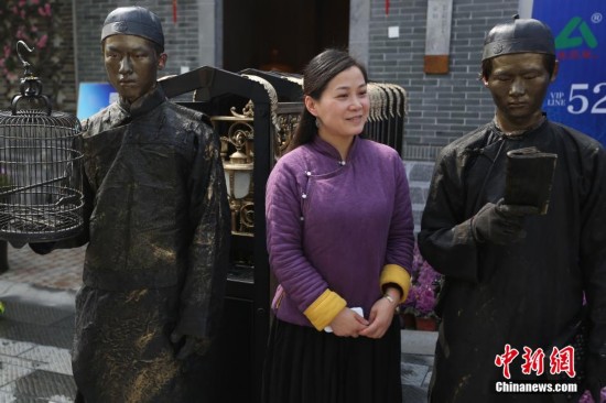 3月21日,南京城南老街上,活体雕塑正在“走街串巷”。近日正是出门踏青之季,商家们纷纷搞起各种形式的促销活动吸引外出民众关注。中新社发 泱波 摄