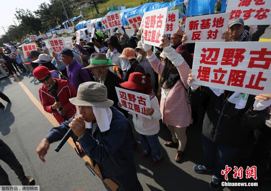 当地时间2015年3月23日,日本冲绳名护市,民众在美军施瓦布军营前示威,要求暂停边野古海底钻探作业,抗议美军普天间机场迁至名护市边野古。据悉,鉴于日本冲绳防卫局在美军普天间机场搬迁地边野古沿岸地区,为海底钻孔调查而投入海中的混凝土块损伤珊瑚礁,冲绳县知事翁长雄志称已向防卫局下达指示,要求暂停海底作业。