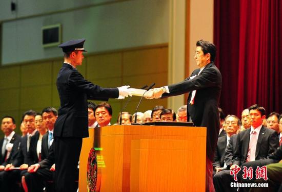 日本首相安倍晋三日前参加位于横须贺市的日本防卫大学毕业仪式。他在向毕业学员发表的“训示”中,再度表达其对于“集体自卫权”的强烈意欲。中新社发 王健 摄