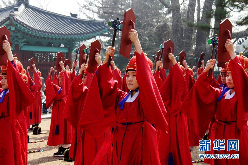 22日,成均馆大学学生在释奠祭中表演“文舞”。新华网记者 彭茜 摄