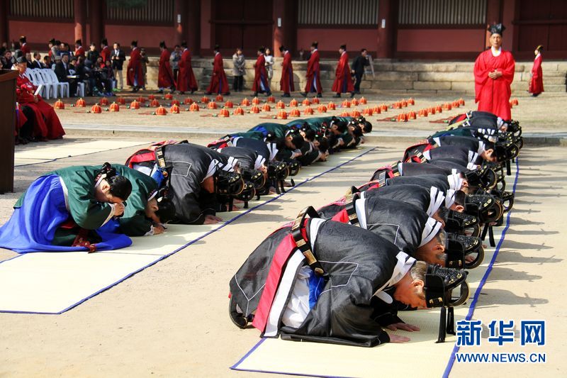 22日,主祭官、分献官、陪祭官在释奠祭中面对大成殿叩拜。新华网记者 彭茜 摄