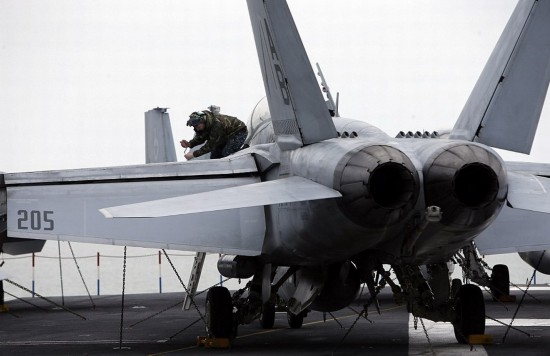 航母的飞行甲板上,空勤人员正在维护各种不同型号的F-18战机。(网页截图)