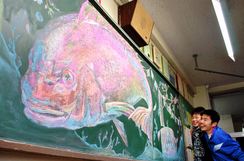 武藏野美术大学有一个项目名为“旅行中的武藏野”,参加该项目的大学生以客座教师的身份访问中小学,并选择这种极具冲击力的方式告知自己的来访。自2011年以来,他们已前后“占领”了4个都县中的120多面黑板。