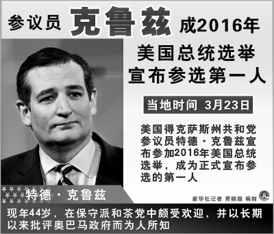 新华社华盛顿3月23日电 美国得克萨斯州共和党参议员特德·克鲁兹23日宣布参加2016年美国总统选举,成为正式宣布参选的第一人。