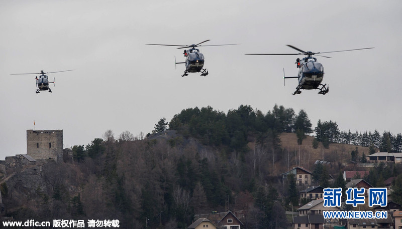 当地时间2015年3月25日,法国Syne Les Alpes,对德国之翼航空公司坠毁客机的搜救行动已于当地时间25日黎明时分在法国南部阿尔卑斯山脉地区重启。参与救援行动的直升机已经起飞,前往飞机坠毁地点。(图片来源:东方IC)