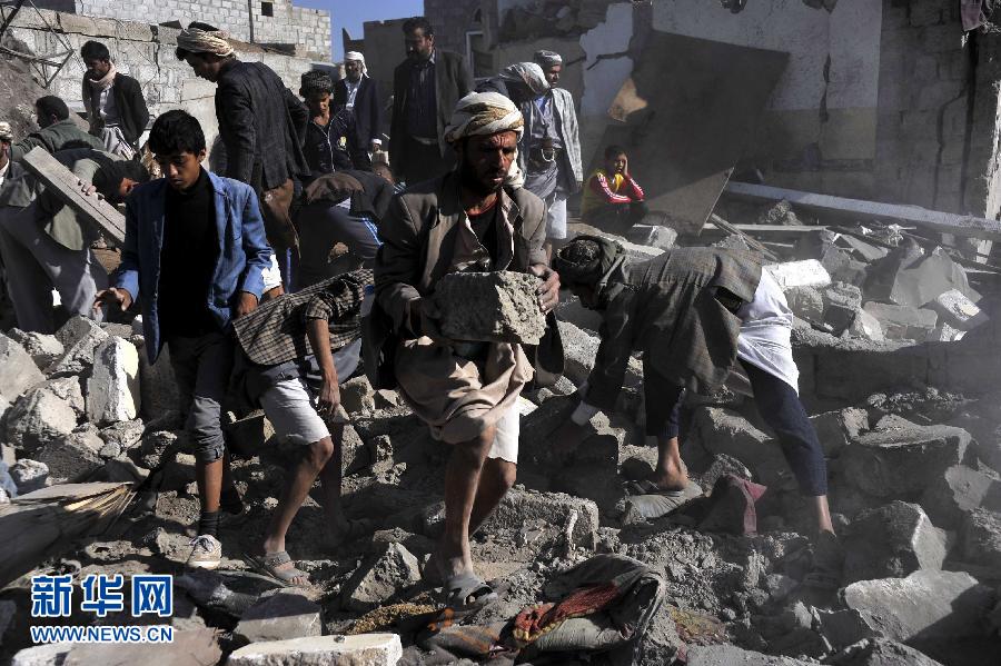 3月26日,在也门首都萨那,人们在空袭现场搜寻伤亡人员。新华社发(汉尼·阿里摄)