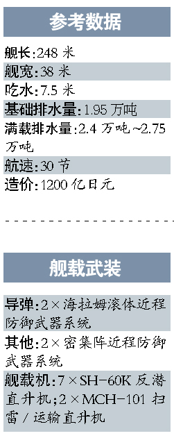 “出云”号基础排水量为1.95万吨,造价约1200亿日元(约合人民币62亿元)。其舰体类似航母,舰首至舰尾由整块甲板贯通,全长248米,可同时起降5架直升机,最多可搭载14架直升机,并能为其他舰艇提供燃料补给。