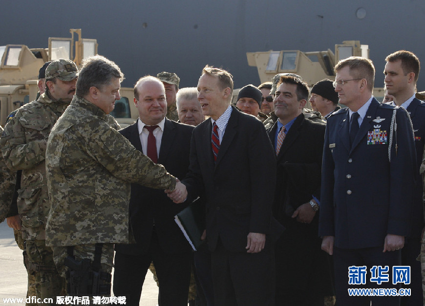 当地时间2015年3月25日,乌克兰基辅,第一批由美国提供的HMMWV军车抵达基辅,乌克兰总统波罗申科参加欢迎仪式。3月11日,波罗申科在新闻发布会上表示乌克兰将接收由美国提供的非致命性军事援助,总价值为7500万美元。