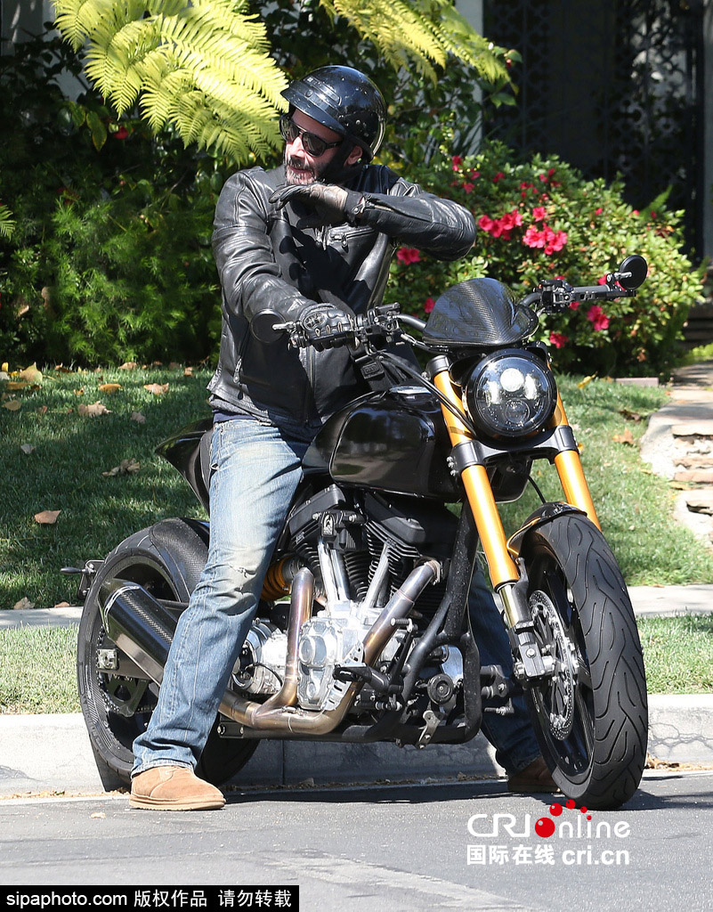 基努·里维斯骑摩托出街 着机车衣戴头盔男子气概十足