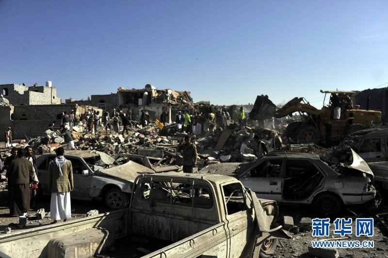 当地时间2015年3月26日,也门首都萨那,沙特与海湾地区盟友针对也门胡塞反政府武装发动空袭,以尽量夺回对亚丁港的控制。当地建筑物遭损毁,民众在瓦砾中寻找伤者。图片来源:CFP