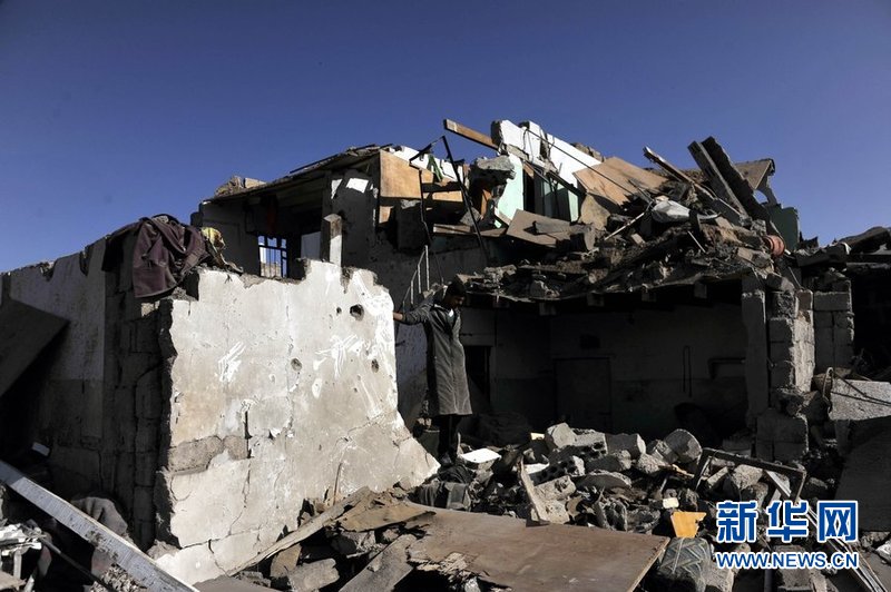 当地时间2015年3月26日,也门首都萨那,沙特与海湾地区盟友针对也门胡塞反政府武装发动空袭,以尽量夺回对亚丁港的控制。当地建筑物遭损毁,民众在瓦砾中寻找伤者。图片来源:CFP