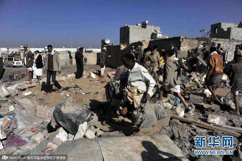当地时间2015年3月26日,也门首都萨那,沙特与海湾地区盟友针对也门胡塞反政府武装发动空袭,以尽量夺回对亚丁港的控制。当地建筑物遭损毁,民众在瓦砾中寻找伤者。图片来源:CFP