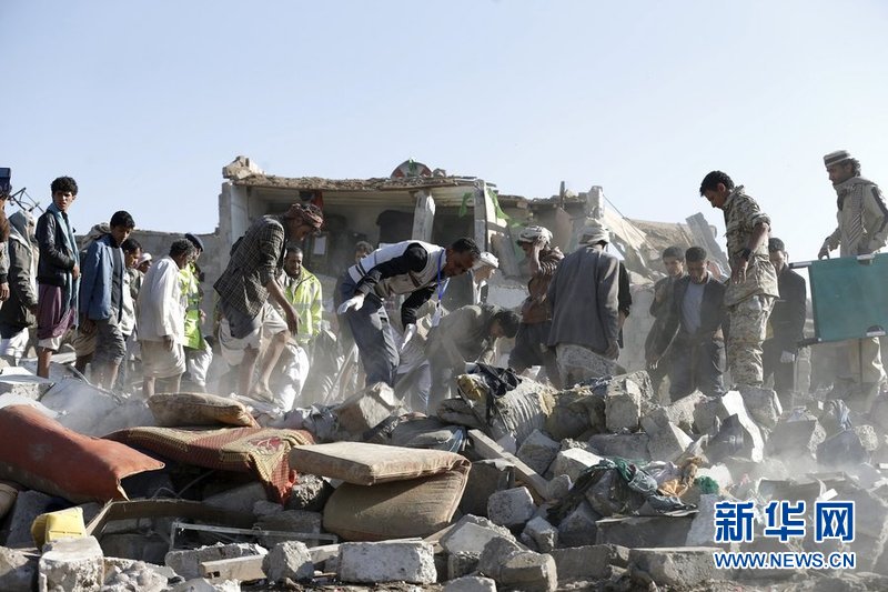 当地时间2015年3月26日,也门首都萨那,沙特与海湾地区盟友针对也门胡塞反政府武装发动空袭,以尽量夺回对亚丁港的控制。当地建筑物遭损毁,民众在瓦砾中寻找伤者。图片来源:CFP