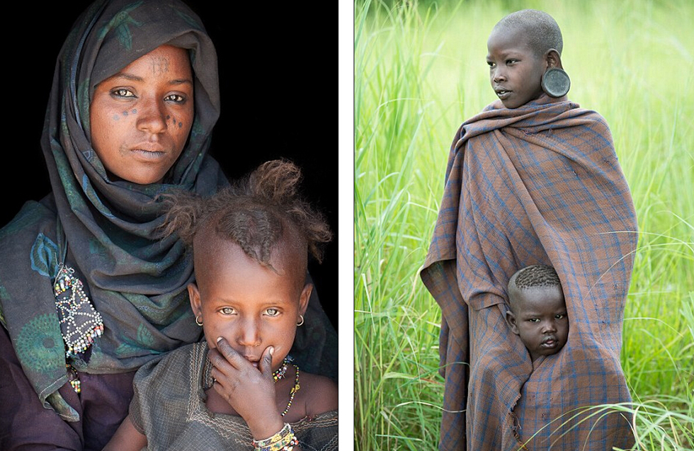 左图是Wodaabe部落的母亲及其孩子,右图来自埃塞俄比亚Mursi部落的女孩正保护其年幼的弟弟。(网页截图)