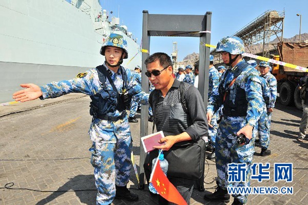 3月29日中午,中国海军第十九批护航编队临沂舰抵达也门亚丁港,准备撤离的中国同胞进行安全检查。 新华社发(熊利兵摄)