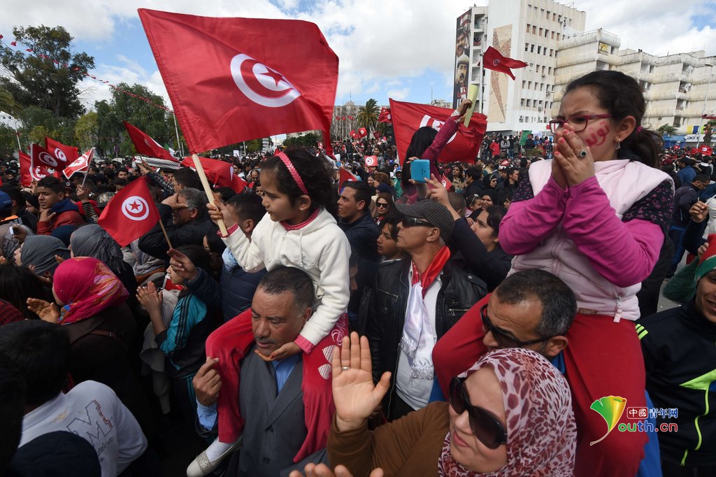 当地时间2015年3月29日,突尼斯突尼斯城,数千民众聚集Bab Sadun广场,前往巴尔杜博物馆游行。此次游行旨在反对恐怖袭击。 突尼斯总统埃塞卜西、法国总统奥朗德、巴勒斯坦总统阿巴斯、波兰总统科莫罗斯基出席。