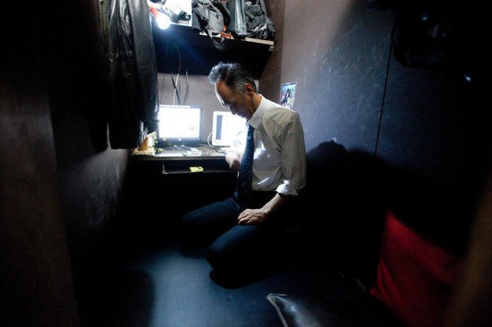 酒井忠幸吃住在东京一间两三平方米的网吧隔间里。