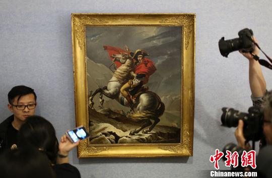 工作人员向媒体介绍“拿破仑文物特展”展品《跨越阿尔卑斯山圣伯纳隧道的拿破仑》。 泱波 摄