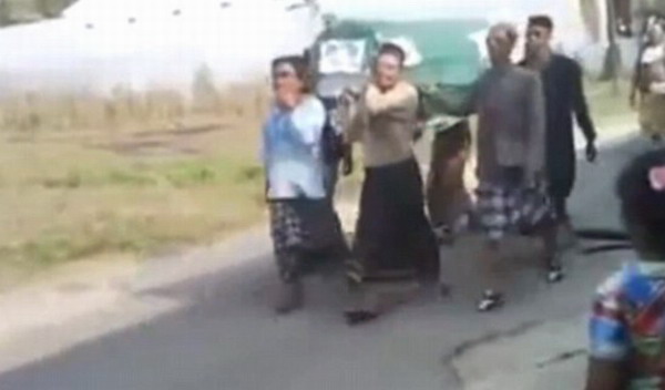 在这场葬礼仪式的拍摄视频中,一群抬棺者匆忙走过围观的路人,但未意识到死者遗体已经掉到了地上。在热心人的提醒下,他们连忙赶回,并将死者尸体重新装回棺材,继续进行葬礼。