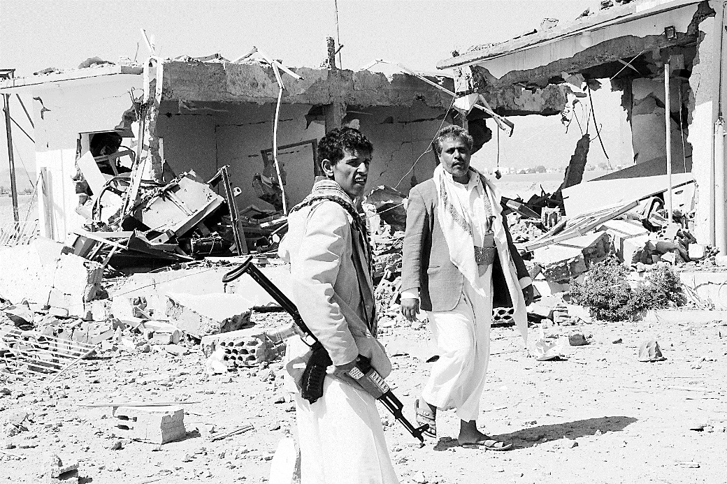 3月30日,也门北部城市萨达,胡塞武装的士兵检查遭空袭破坏的区域。