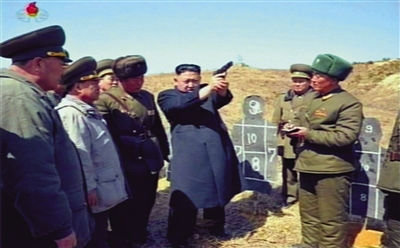 射击 据朝中社2013年3月23日报道,朝鲜最高领导人金正恩当日视察了获“吴仲洽7团”称号的朝鲜人民军第1973部队所属第二营,亲自示范射击姿势。